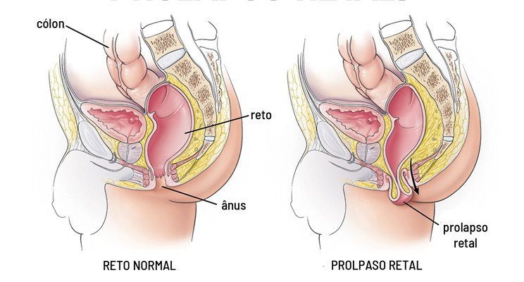 O prolapso retal ocorre por fraqueza da musculatura do assoalho pélvico e partes do reto se exteriorizam pelo ânus.